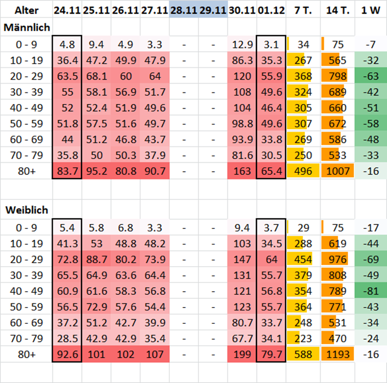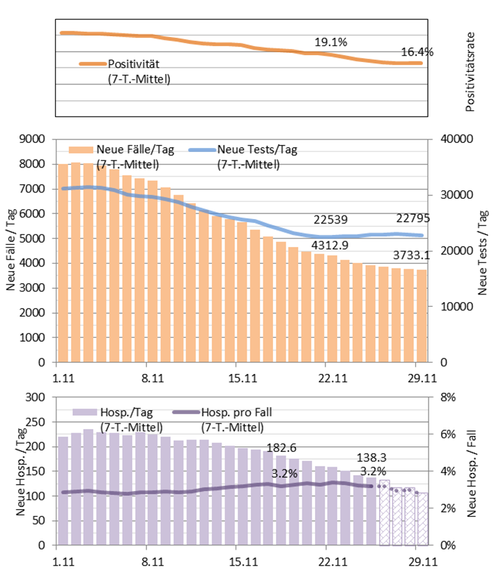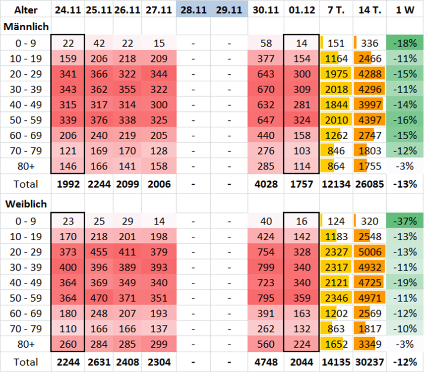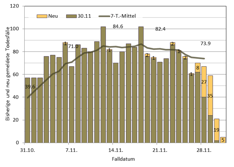 Epidemiologische Kurve der letzten 4 Wochen (bis 29.11./25.11.):