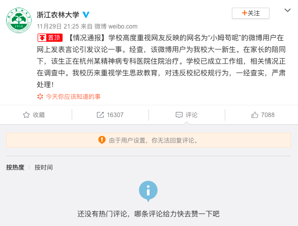 On Sunday, Zhejiang A&F University confirmed that Xiaomugoune is a first-year student, that she has been sent for psychological treatment because of her blog posts, and that the situation is “under investigation.”