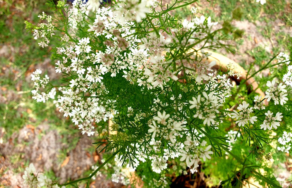 Good morning! Here's our dhanya (coriander/cilantro) that's turned itself into a wedding bouquet. 🙄 I don't know how long it will be before we have leaves to eat again.