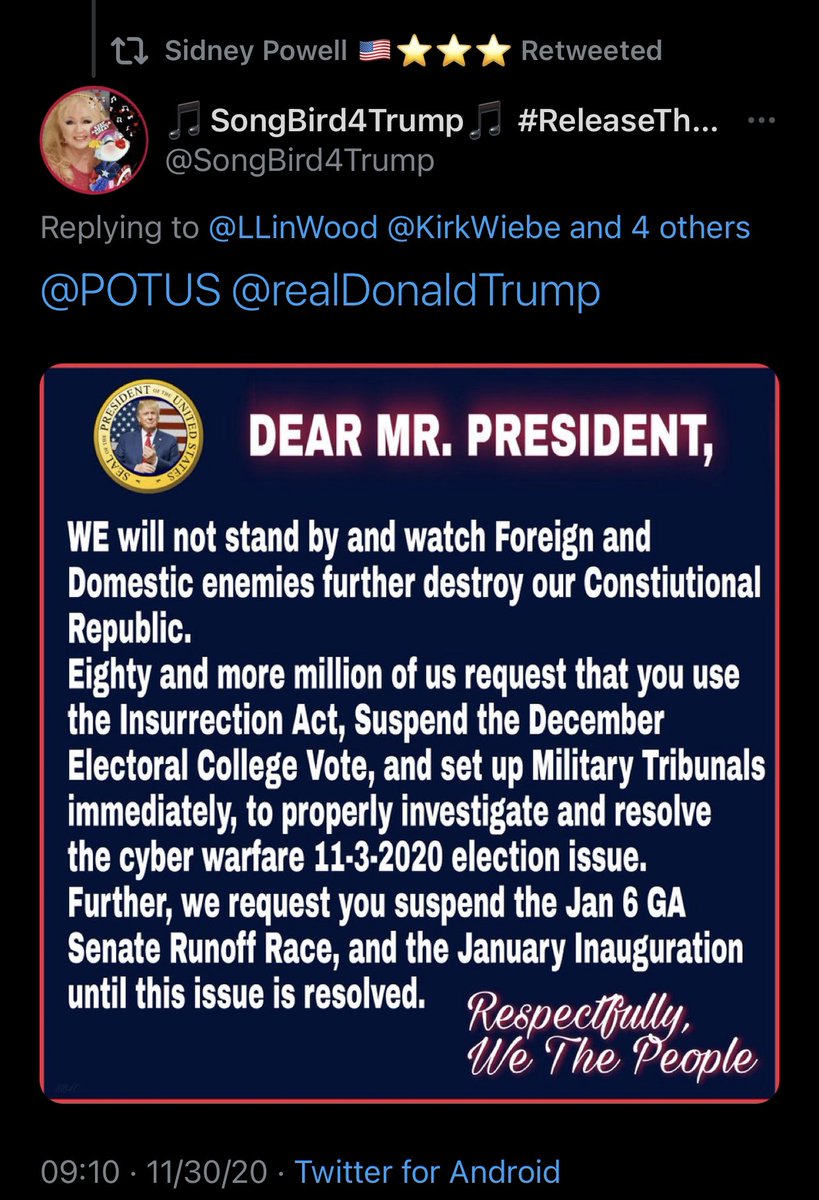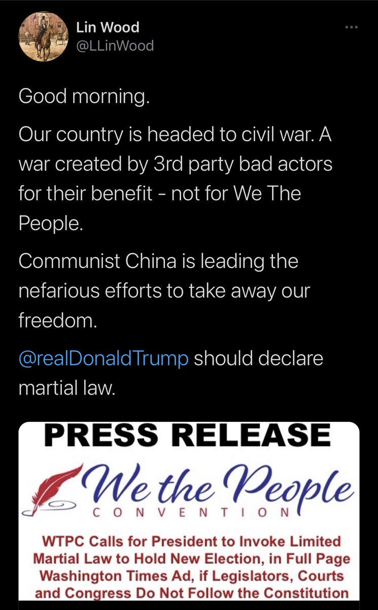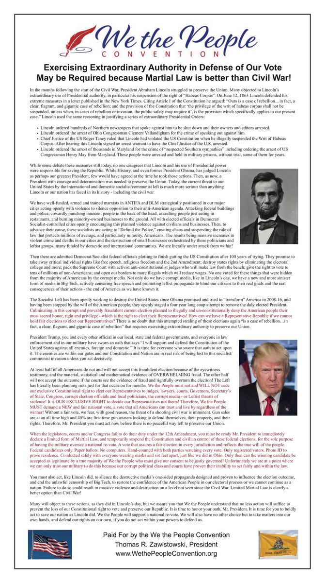 3-révolte populaire armée. Les 8 tweets ci-dessous font écho aux demandes croissantes faites à Trump de prendre une mesure drastique pour annuler l’élection 2020. Si parmi ces fidèles ont fantasme sur la mise en place d’une sorte de loi martiale avec procès militaire pour