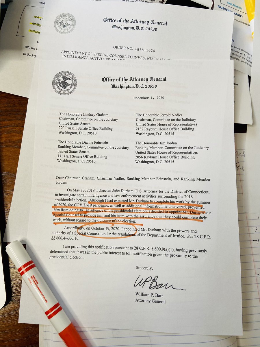 #Durham#NewEvidence READ: Letter to House + Senate Judiciary committees obtained @CBSNews AG Barr says he expected Durham to complete his criminal investigation by Summer 2020 but it was delayed due to COVID-19 + "additional evidence (Durham) uncovered." Barr said Special