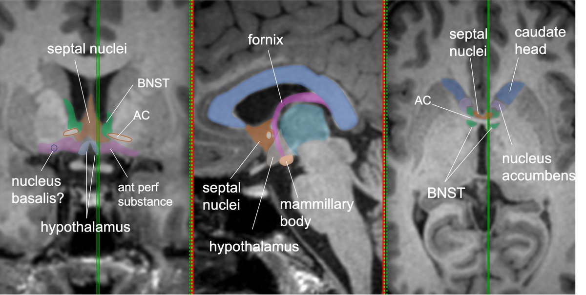 Note: lots of confusion about structures of basal forebrain ant/inf/about the AC—for good reason! Mixed GM/WM of ant perforated substance, substantia innominata/nuc Basalis, septal nuclei/BNST, nuc accumbens, subcallosal cortex-all in close proximity, similar MR intensity