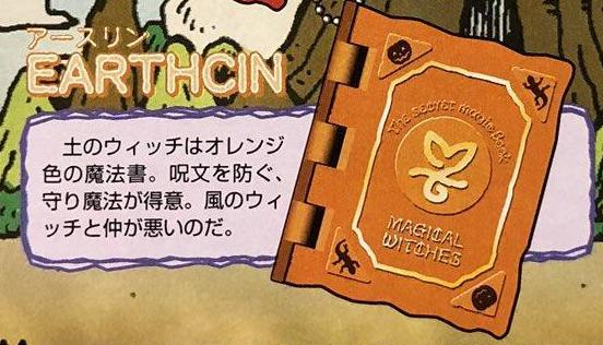 The Earth Witch (土のウイッチ) is from Earthcin and exists within the Orange Speelbook (オレンジの魔法書). They are good at Defensive Magic (守り魔法) in order to prevent spells, they aren't in good terms with the Wind Witches.