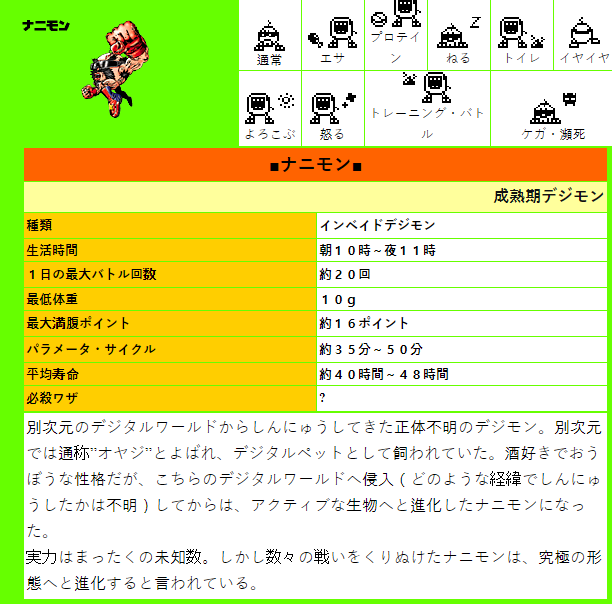 There we would see the connection between Digimon and other V-Pets. mostly known by Nanimon, whose profile directly mentioned that he was an invader from another dimension, that was known as OYAJI and was raised as a digital pet, a well known reference to Tamagotchi.
