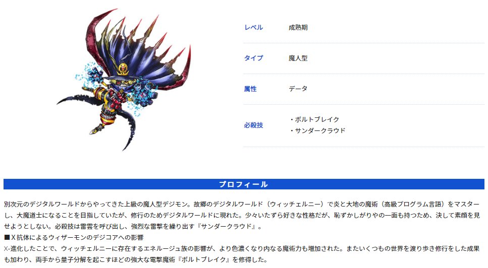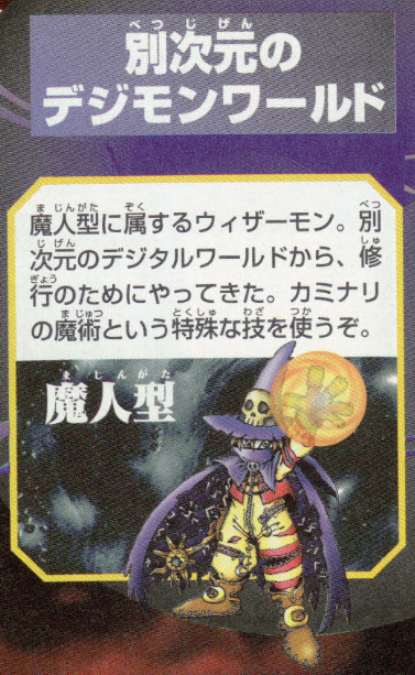 This other world was called "Witchelny" (ウィッチェルニー). Wizarmon already was a master in the Earth and Fire Sorcery (魔術) in his homeworld. He traveled to the Digital World in order to train more and become a master into the "Thunder" magic.