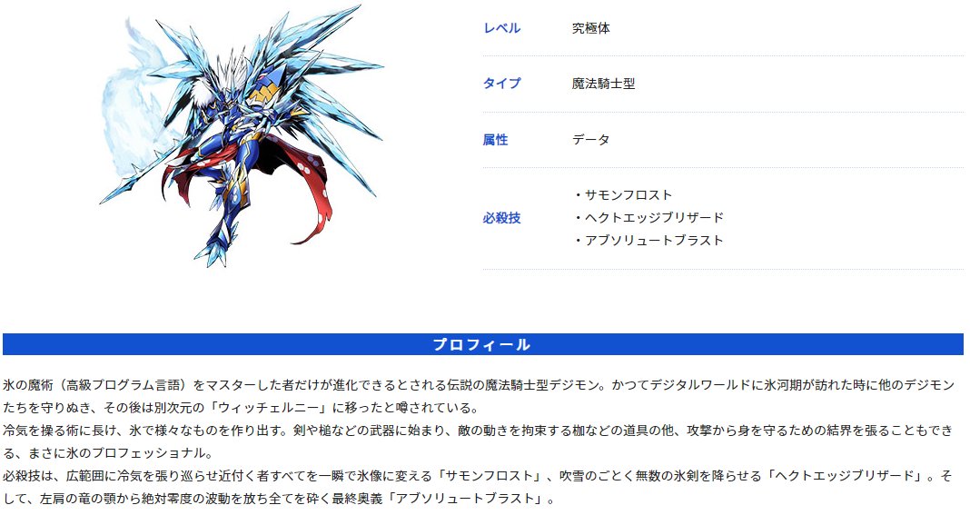 Still in 2019 the profile for Hexeblaumon was revealed for the Digital Monster X toyline, and it was revealed that this as a master in ice sorcery and traveled to Witchelny after saving a lot of Digimon during the Digital World's Ice Age.