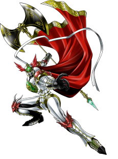 Medieval Dukemon is called "Legendary Hero" in Witchelny as it saved the world from invaders in an ancient past while Sorcery was still immature. This Digimon appeared and saved the world and rules over the "Vortex Warriors" that fights with weapons made by the Wind Sorcery.