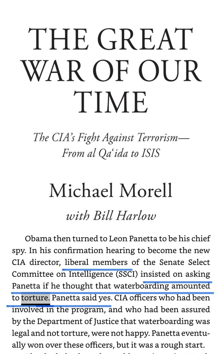 5/ In the 2015 book, Morell defends telling 60 Minutes “that the [CIA]’s EITs were not torture.” [EITs are a reference to the CIA’s torture tactics]. Then Morell doubles down and makes clear that only “waterboarding” was “inconsistent with American values.”