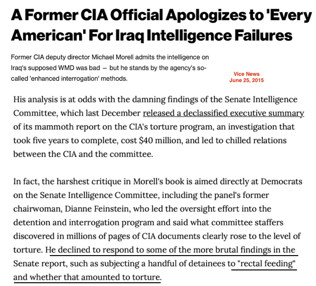 6/ While promoting his book, Morell even “declined” to say if the CIA’s use of “rectal feeding” for interrogation purposes was torture. See this VICE news report from bit.ly/3mBYvHi