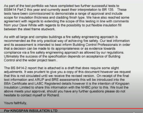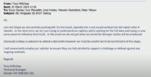 He then emails the BRE, cc-ing the company's lawyer, threatening that "we may have no other option" but to challenge if BRE deems the test a failure. In the event, BRE does deem it a failure. But we learned today Kingspan nonetheless used the data in future 'desktop studies'