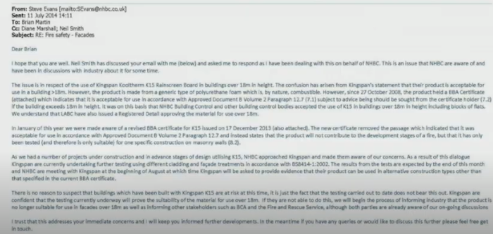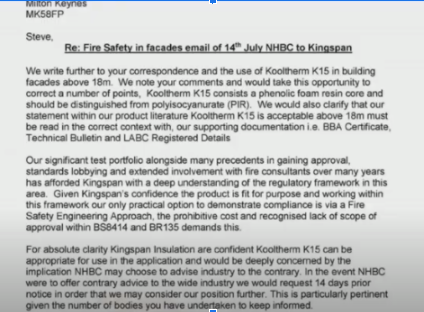 NHBC responded to Mr Martin with very detailed email outlining Kingspan's sale of its insulation to many blocks of flats, resulting from KS statement that the product was acceptable for use on high rises, and that fire and rescue service were "aware" (sorry🔎)