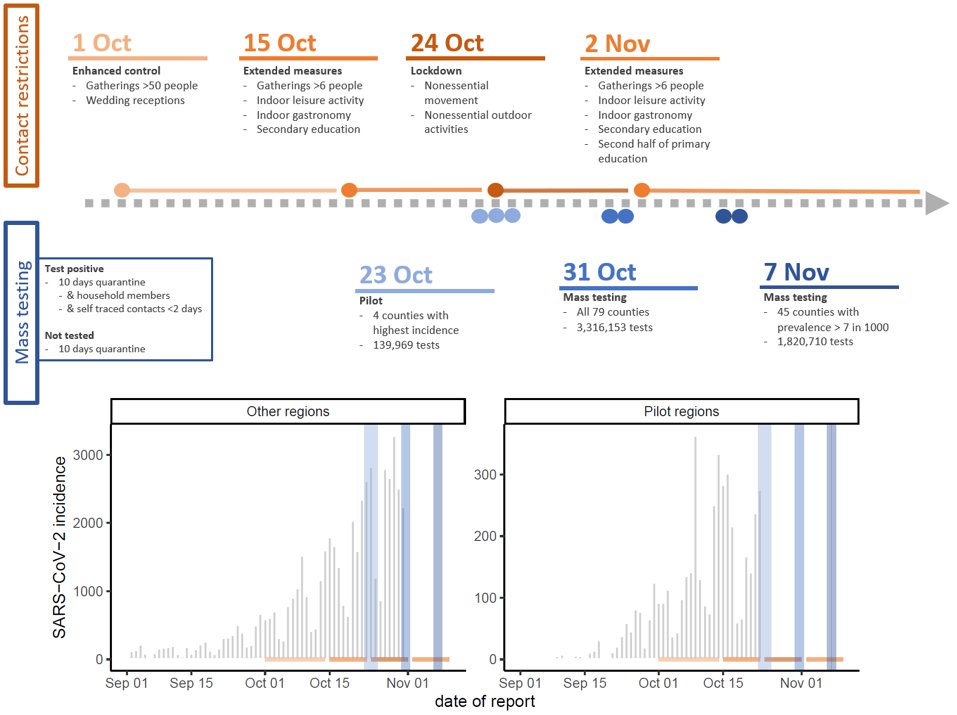 Slovakia gradually scaled up their contact restrictions during Oct as cases kept rising. Then introduced mass testing, first in 4 pilot counties, then nation wide and then in 45 high prevalence counties with a week between each.