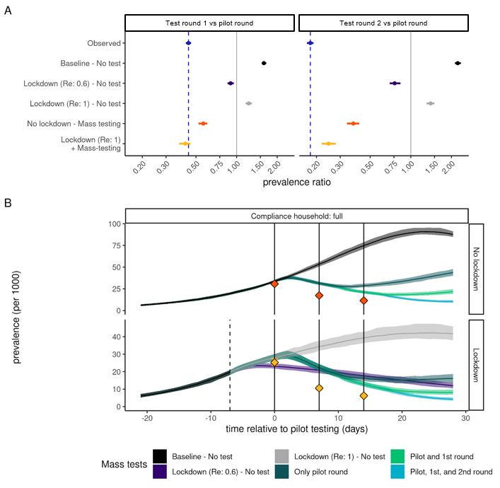 In a microsimulation model the observed effect was best explained by a combination of a moderately effective lockdown and the effects of mass testing with strong adherence to quarantine of test-positive and their household contacts
