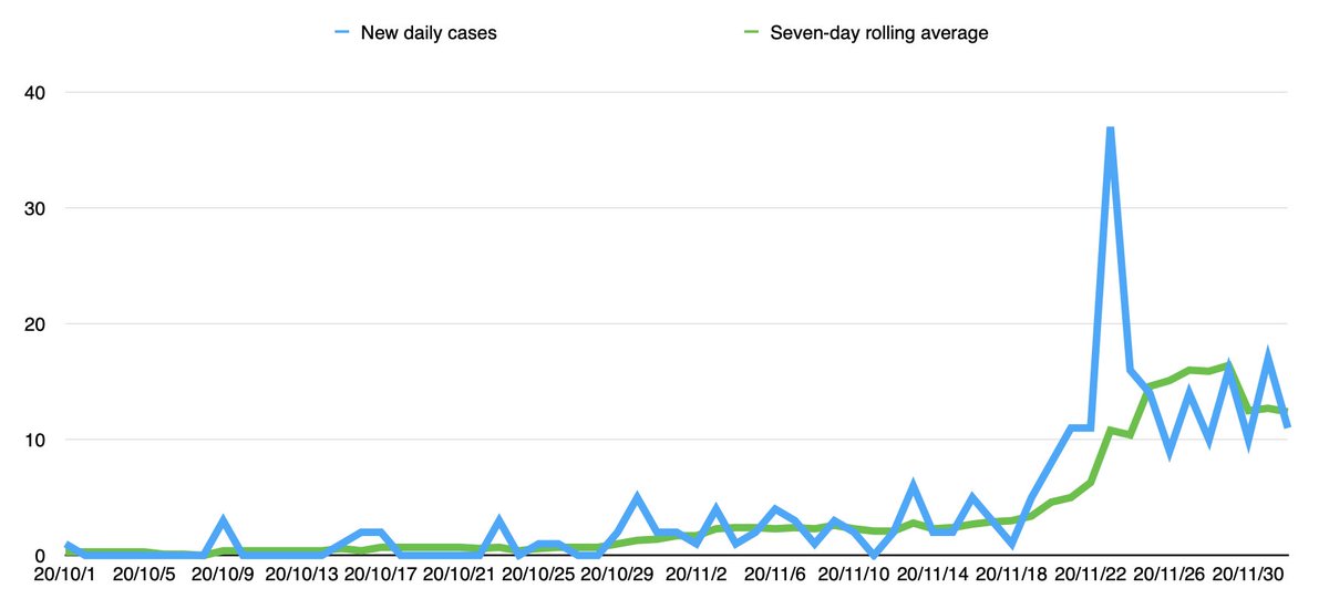 Here is the new daily cases and 7-day rolling average since the start of the second wave (Oct. 10):