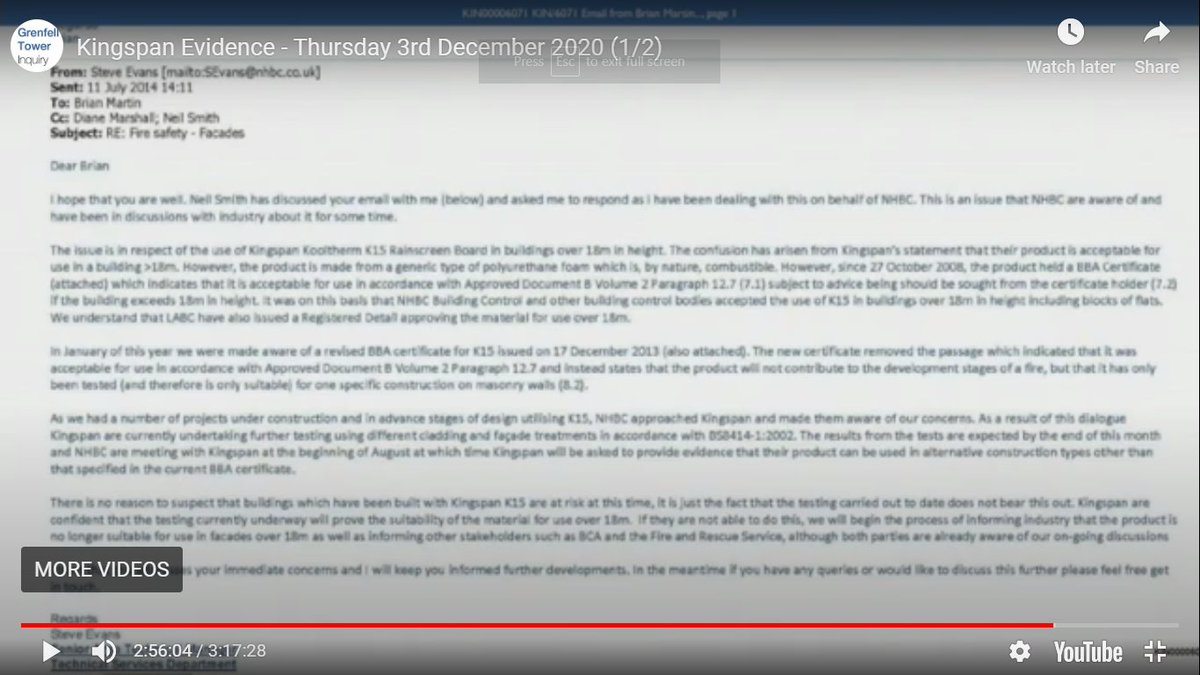 NHBC were actually at this stage in quite a protracted dispute with Kingspan at this point about the use of its K15 insulation on high rises. NHBC's Steve Evans responded to Mr Martin with a very detailed email explaining how and why Kingspan was so widely used.