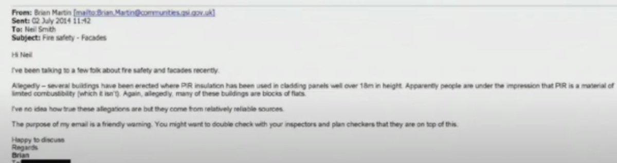 In July 2014, he wrote to the NHBC saying "allegedly" PIR insulation had been used on buildings above 18m in height and asking for info. I think this follows a meeting about cladding risks from the same month, which I obtained the minutes of in 2018 insidehousing.co.uk/news/news/gove…