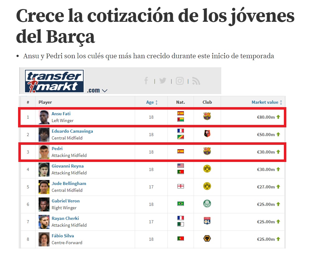 Ara que està de moda parlar de fitxatges mediàtics pel Barça... Fixeu-vos com n'és d'efectiu apostar pels joves en comptes de cromos de 100M€. El Barça ja té 2 dels 5 sub-18 més cotitzats del món. El valor d'Ansu Fati i Pedri al mercat és 110M€, el cost conjunt ha sigut 6M€.