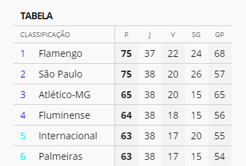 No 1º turno empatamos com o Grêmio, logo mantendo o resultado assim como com Inter e Palmeiras, o Flamengo poderia chegar ainda aos 76 pontos, enquanto o SP ficaria com 75. Se vencer um desses, pode alcançar 78 e um aproveitamento de 81,25% nas últimas 16 rodadas e 68,42% total.