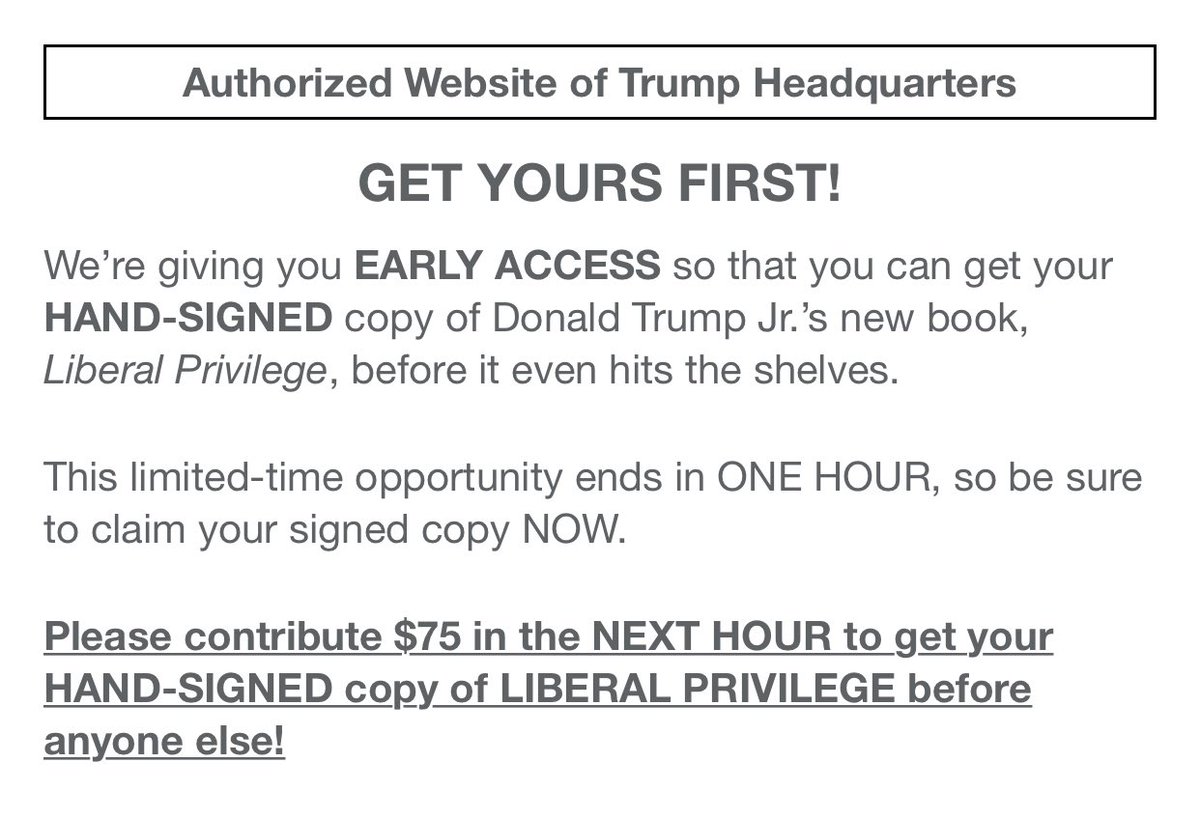 7- Après tout, c’est ce que Trump vend à ses supporters. Son besoin URGENT de cash pour sauver la démocratie US. Un discours efficace puisque, de concert avec le GOP, il a levé 207 millions en un mois. Dont seulement 8,8 millions ont été versé à la cause. Le reste? Vous le savez