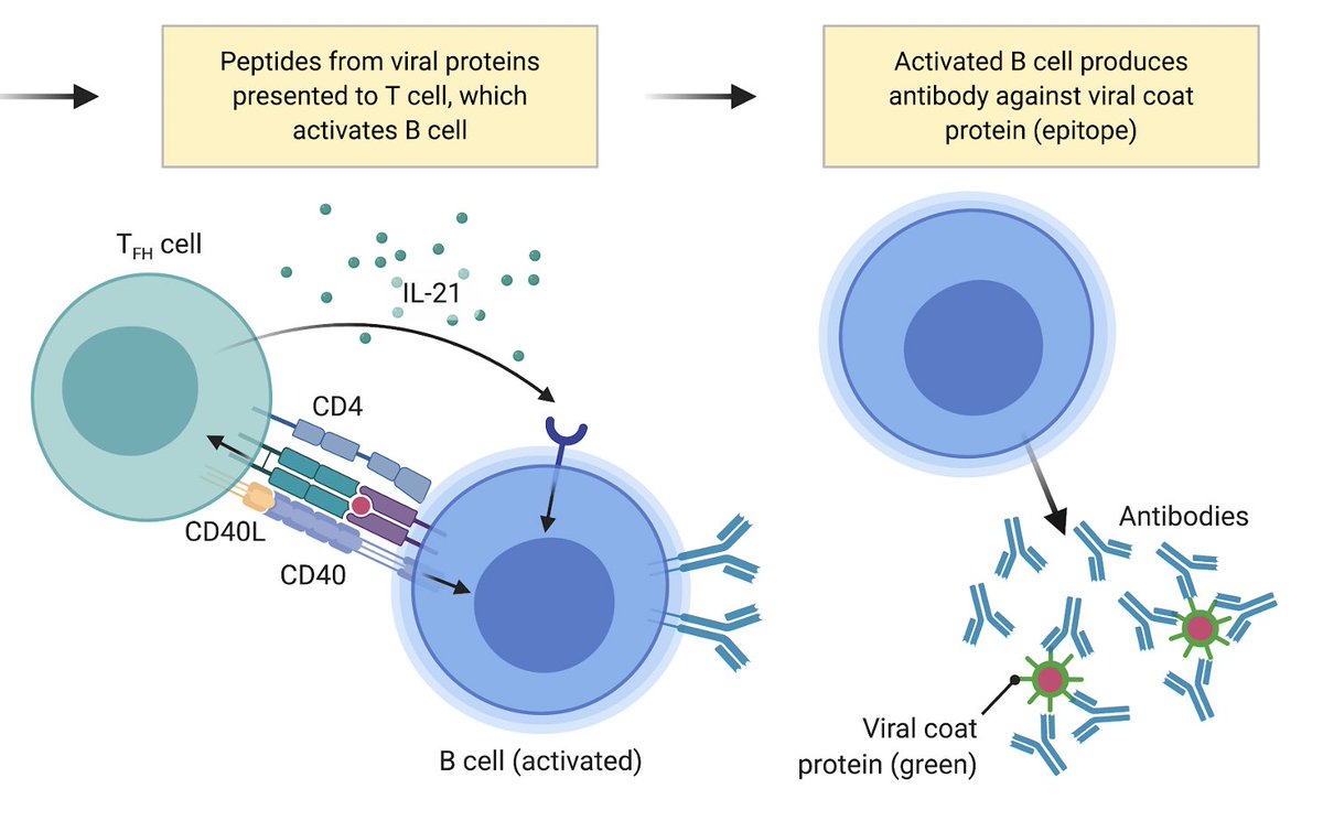 B cells detect pathogens structures through antibodies. T cells cannot detect pathogens on their own. They can only “see” pathogen when tiny pieces of viral proteins (peptides) are presented by molecules called major histocompatibility complex (MHC). (3/n)