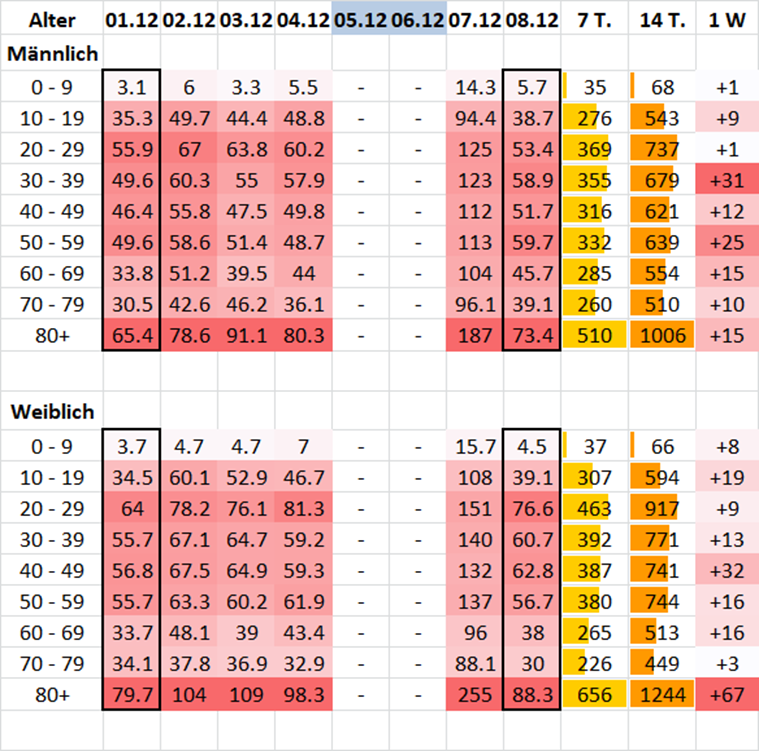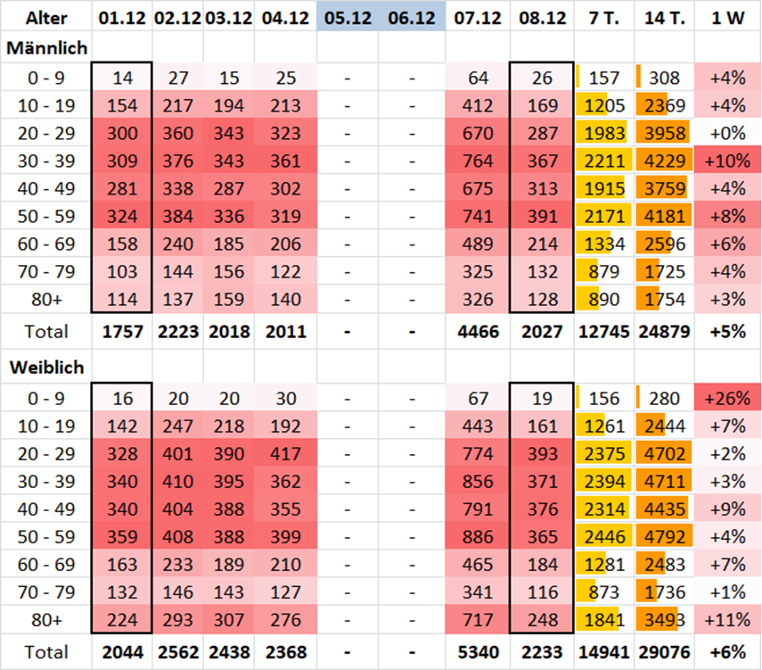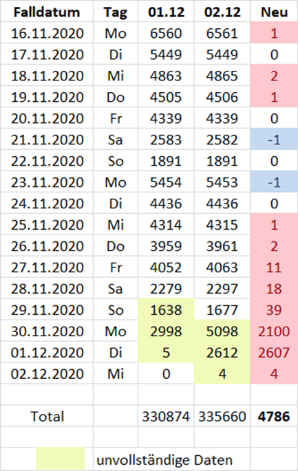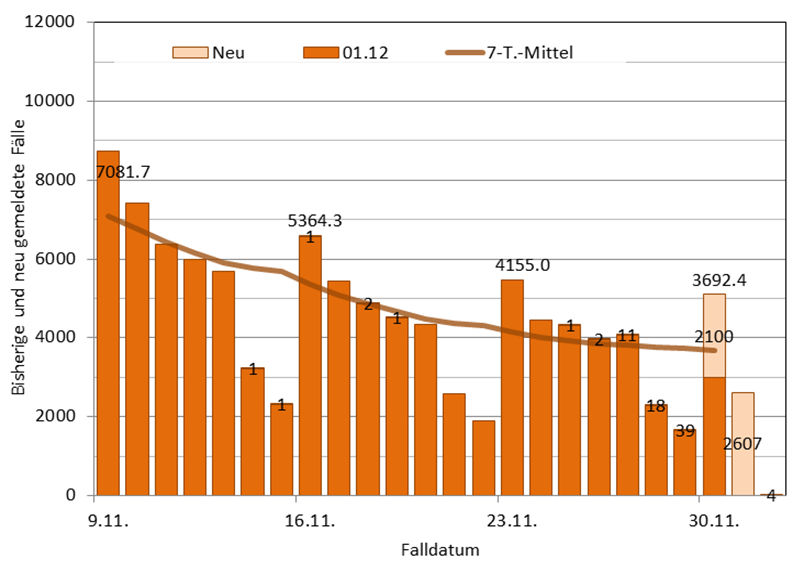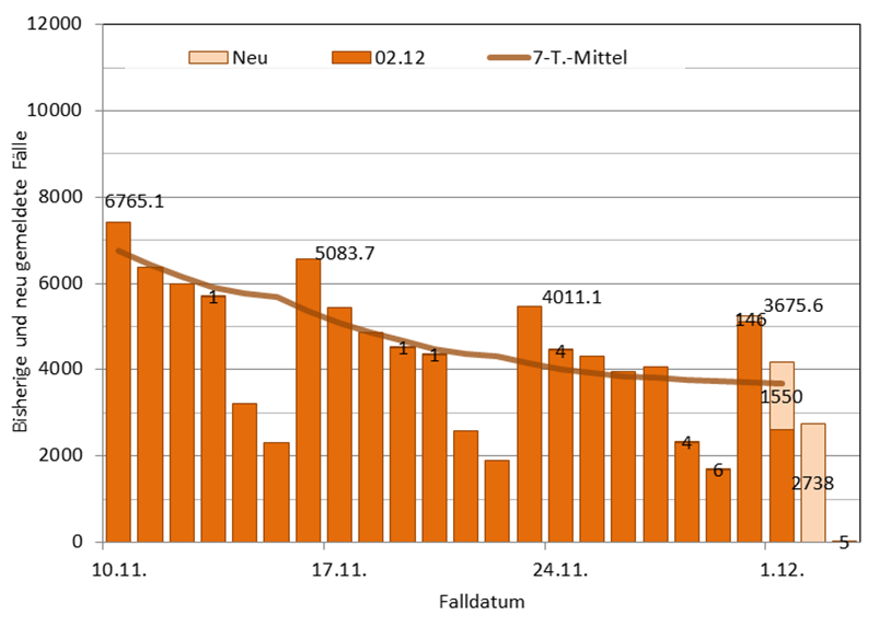 Epidemiologische Kurve der letzten 4 Wochen (bis 6.12./2.12.):