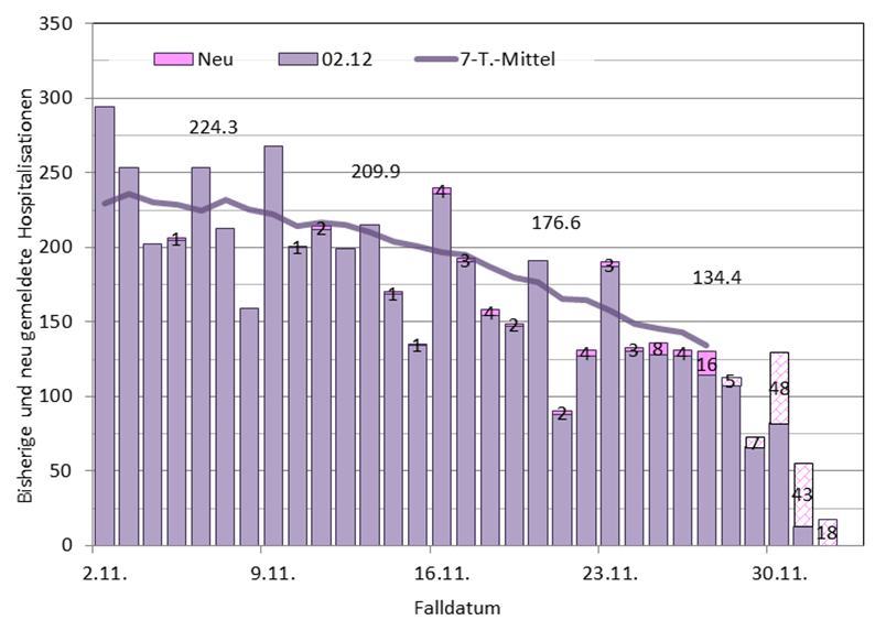 Spitaleintritte leicht abnehmend, Hospitalisationsrate gleichbleibend, es ist mit Nachmeld. zu rechnen