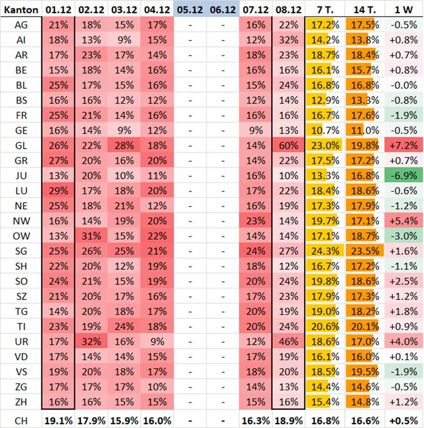 Veränd. in Prozent der Anz. Fälle pro Kanton in 1 Woche zur Vorwoche: