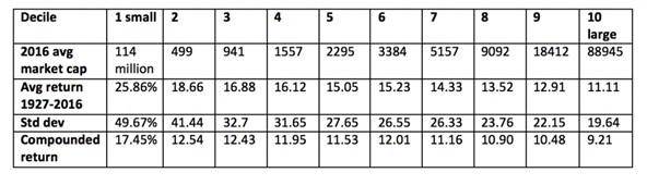 4/ No lo digo yo, lo dicen los datos. No hay mucho que discutir. En esta tabla, podemos ver las rentabilidades ponderadas y desviaciones estándar de las rentabilidades para los 10 deciles entre 1927 y 2016. Fuente: “What Works on Wall Street”, de James O'Shaughnessy.