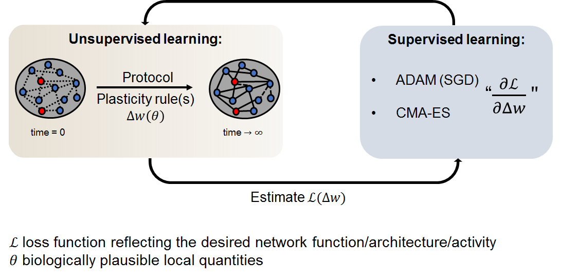 Towards that goal, we built a 2-layer optimisation framework. In layer 1, a network acquires a function / structure by way of unsupervised plasticity rule(s). In layer 2, the plasticity rules themselves are optimised so as to ascribe the *right* function/structure to the network.