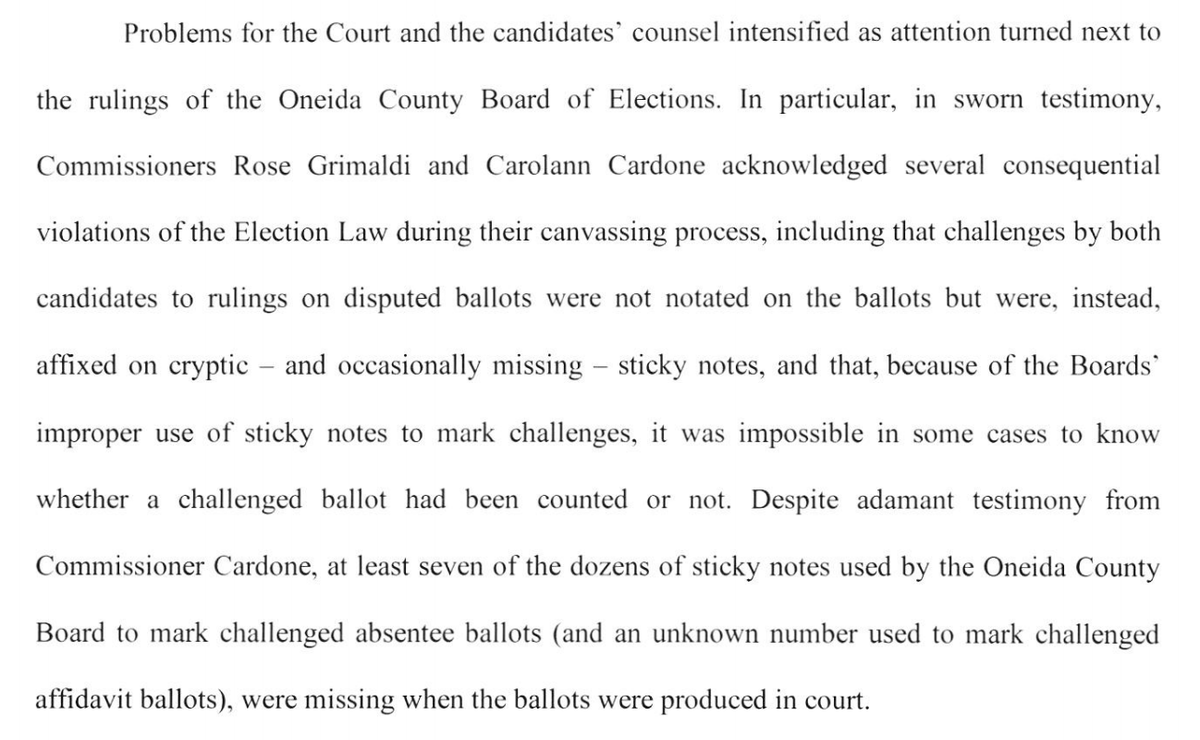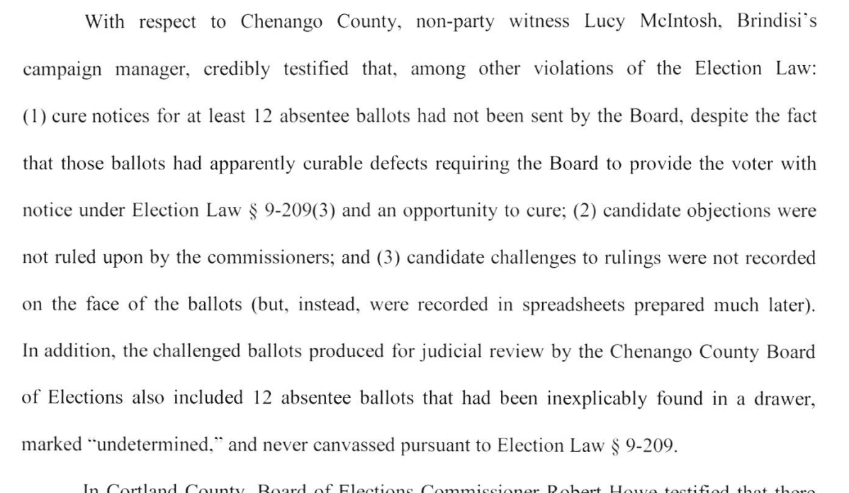 We move on to Chenango, where tucked into his critique is the justice's findings that Lucy McIntosh, Brindisi's campaign manager, was a credible witness, and the Chenango BOE made several errors. Also note the 12 found drawer ballots we learned about yesterday 12/