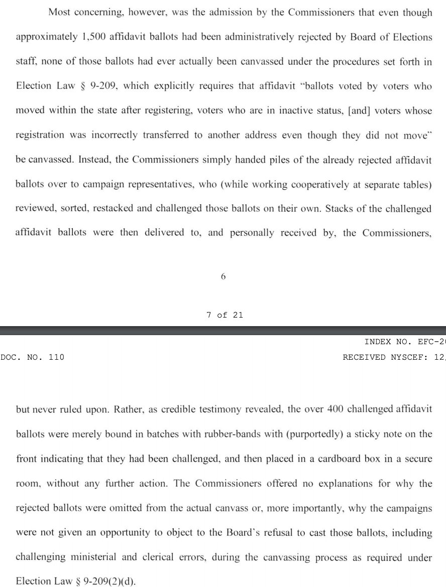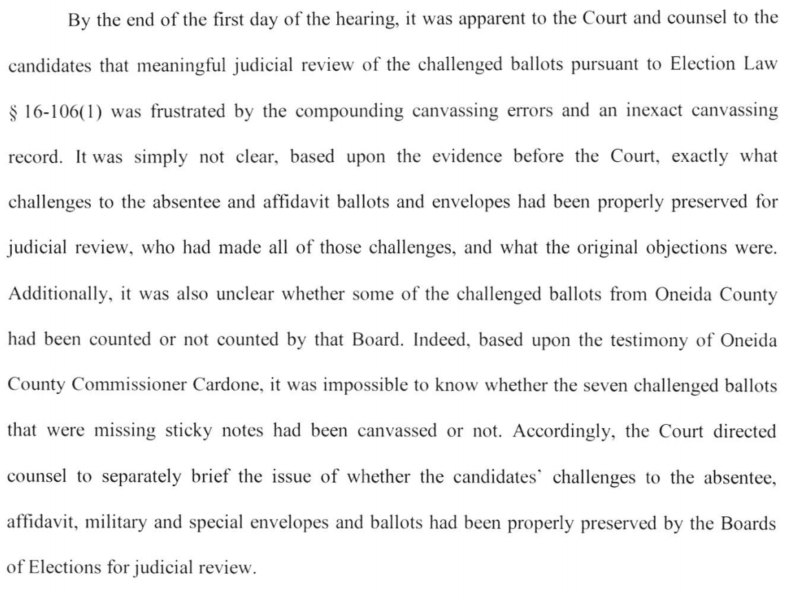 The first truly new thing I learned in this ruling comes from Cortland County, where 100 affidavits were rejected by the commissioners, not counted and set aside. It appears neither candidate nor their representatives had a chance to challenge these 13/