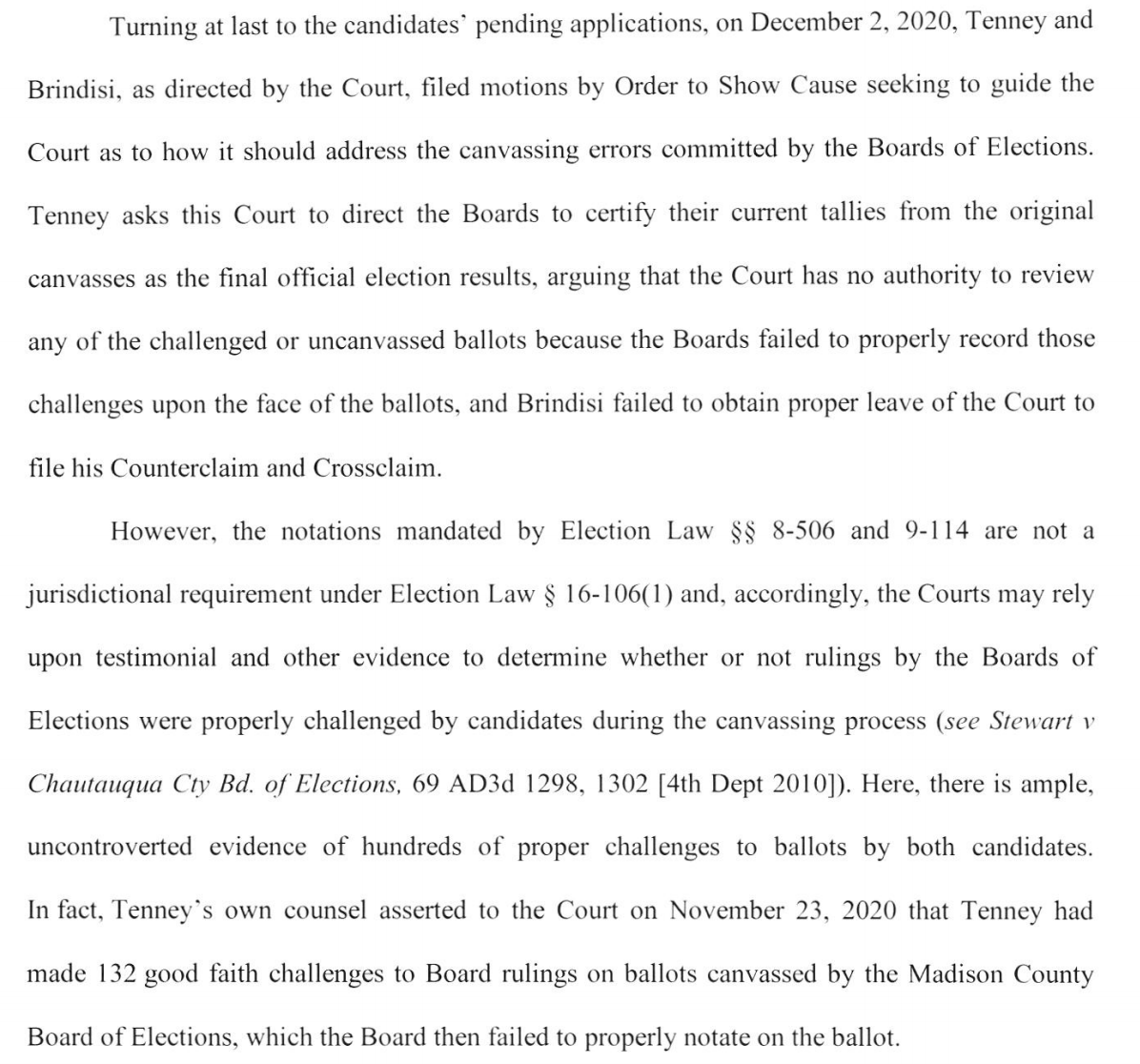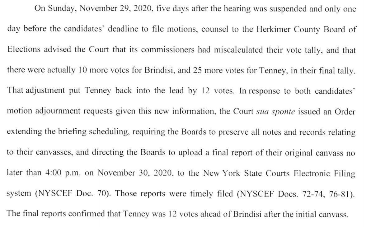 We find out in this section that the boards made the parties involved aware that new counts showed Brindisi potentially in the lead, which is when the justice adjourned court and sent us down the path that leads to now 14/