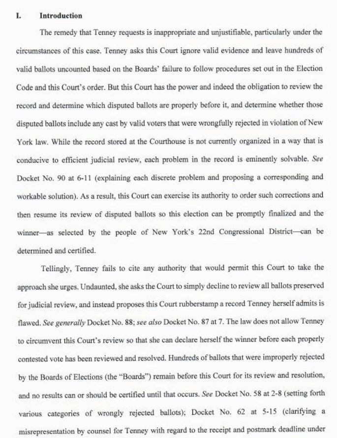 The Brindisi legal team filed first today, and tried to offer a stinging rebuke of Tenney's attempts to have the result certified. Certainly started out swinging 3/