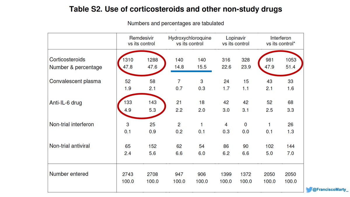 Maybe I'm just daydreaming, but then you go to Table S2 of Solidarity Trial and see that almost 50% of patients in the #remdesivir and #interferon arms got #dexamethasone, something everyone started doing in June 2020 for sicker patients compared with 15% of #HCQ