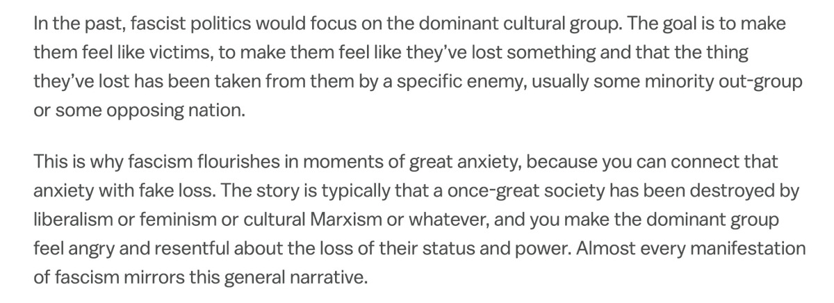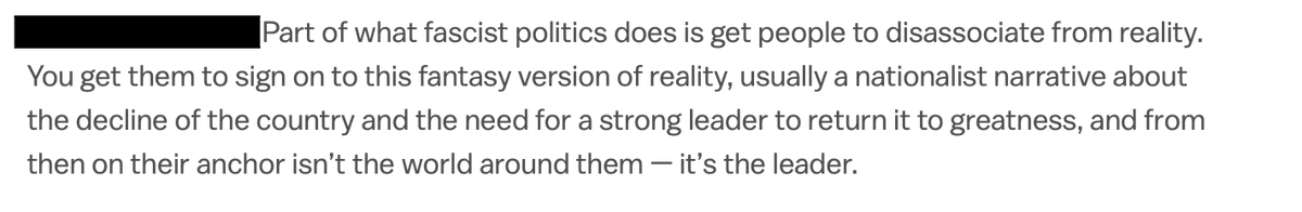 ...push people into a fantasy world that depends on identification of "the other" (in this case, democrats) who will destroy the nation and prevent return to a mythical past. This is standard fascism, and the violence out of desperation could break soon. Or hopefully these.../3