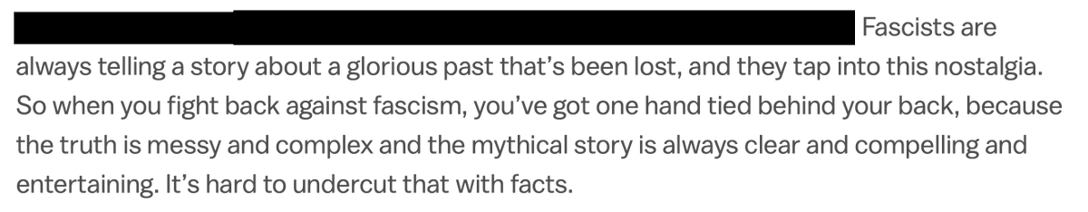 ...obtain for them and their rich donors through the adoption of fascism. Authoritarians are relentlessly using the techniques of national mythology to create an alternative, fictional reality that ultimately delivers them the power to oppress and control..../6