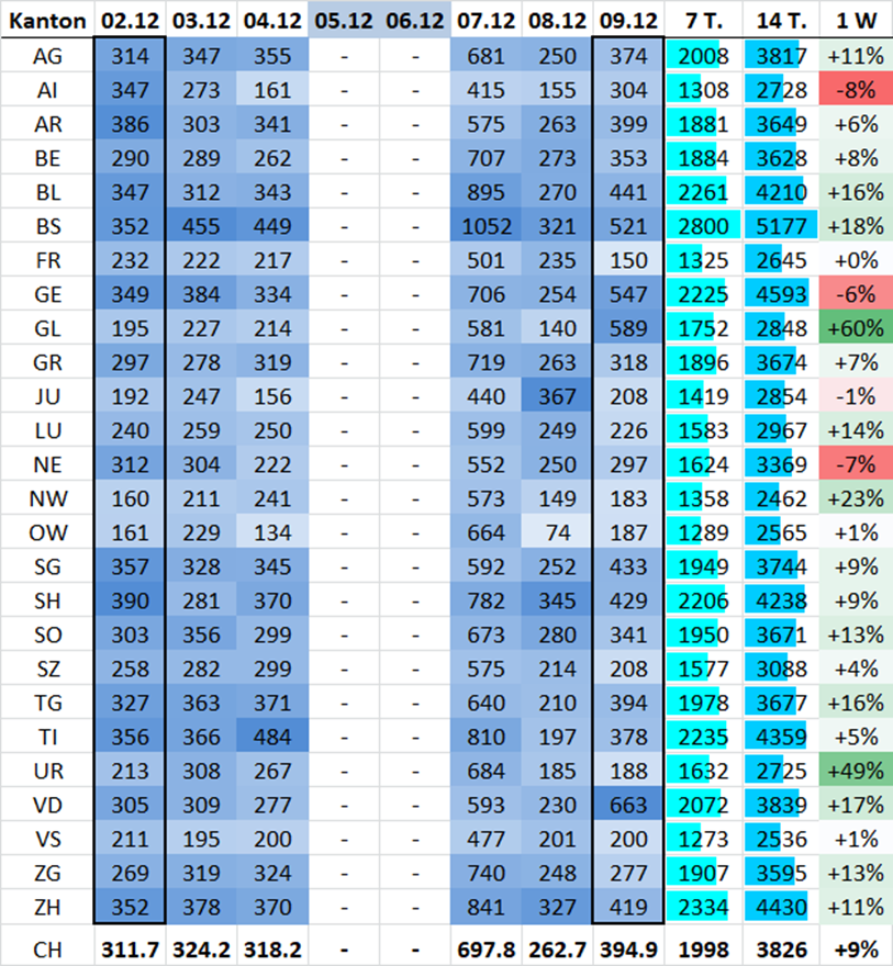 Die Fallzahl ist höher als an den letzten zwei Sa-Mo, wo 8'782 und 9'809 gemeldet wurden.