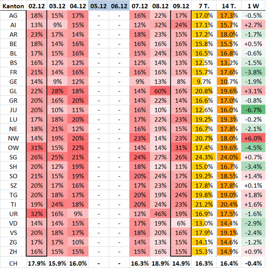 Veränd. in Prozent der Anz. Fälle pro Kanton in 1 Woche zur Vorwoche:
