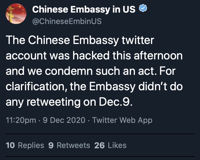 4. The embassy has deleted the retweet of Trump from @ChineseEmbinUS. It retweeted Trump's attack on the election before 1 pm EST and deleted the retweet later this afternoon, after the post got attention. People have screencaps, including @tianyuf.