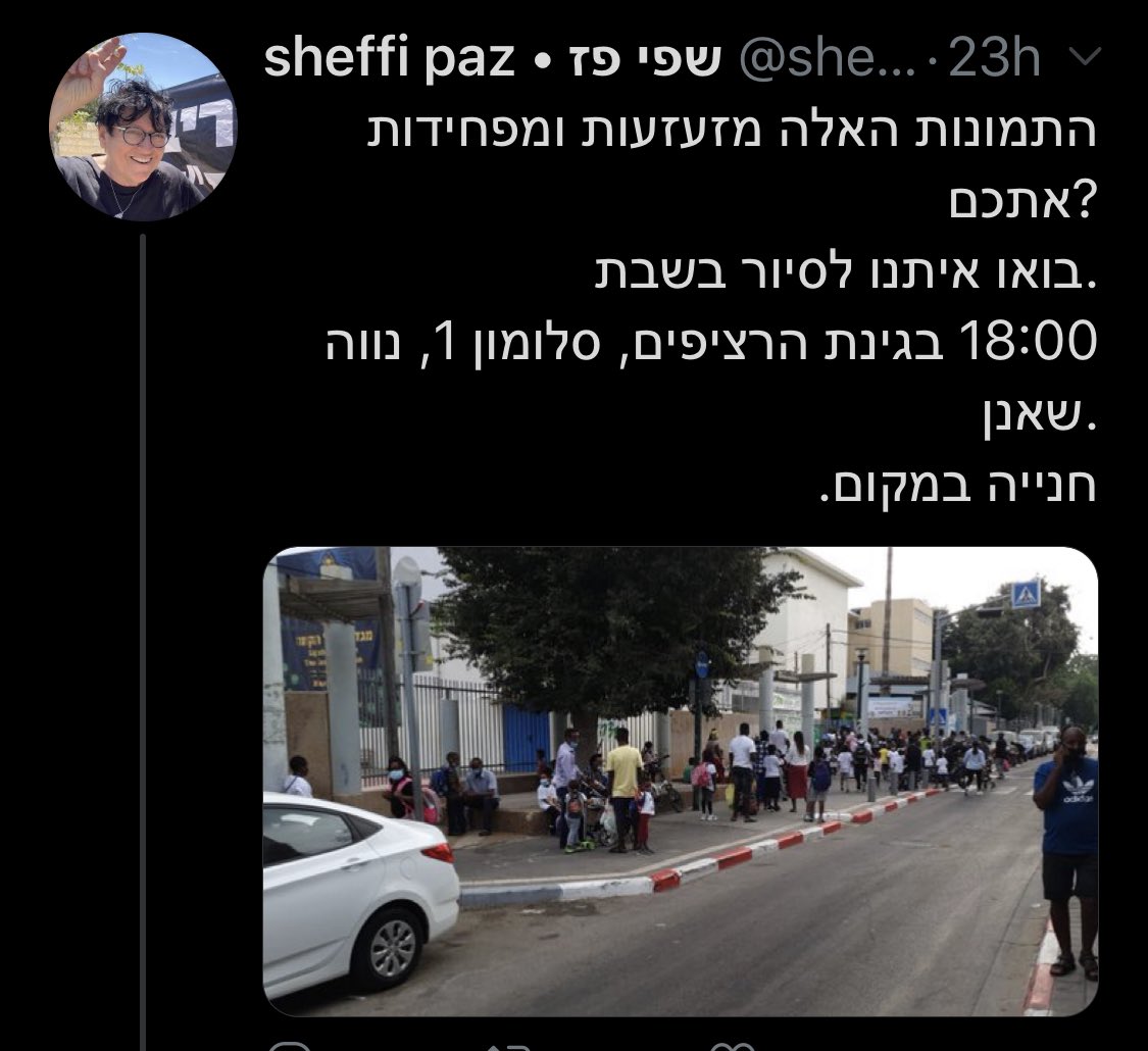כל מה שראיתי בתמונה הם אנשים שחורים. בכמות סבירה. ברחובות תל אביב. הולכים. ולא יודע למה אבל הדהים אותי הציוץ. לא בגלל הגזענות, היא לא חדשה פה, אלא בגלל חוסר הצורך אפילו לנמק אותה. ללא בושה, מהמקפצה, כי מותר. אם מזעזע אתכם לראות שחורים ברחובות שלנו, בואו! הבנאליות של הגזענות