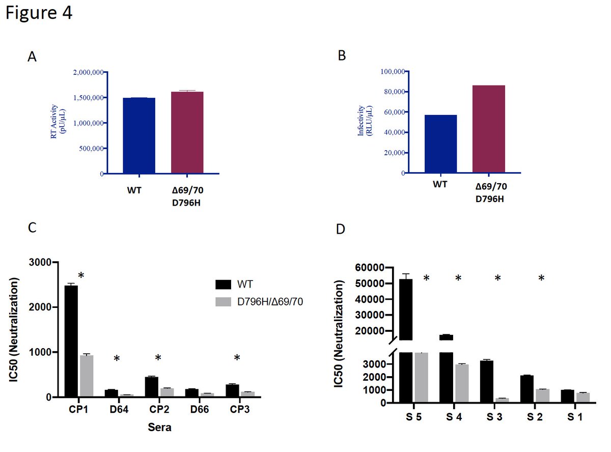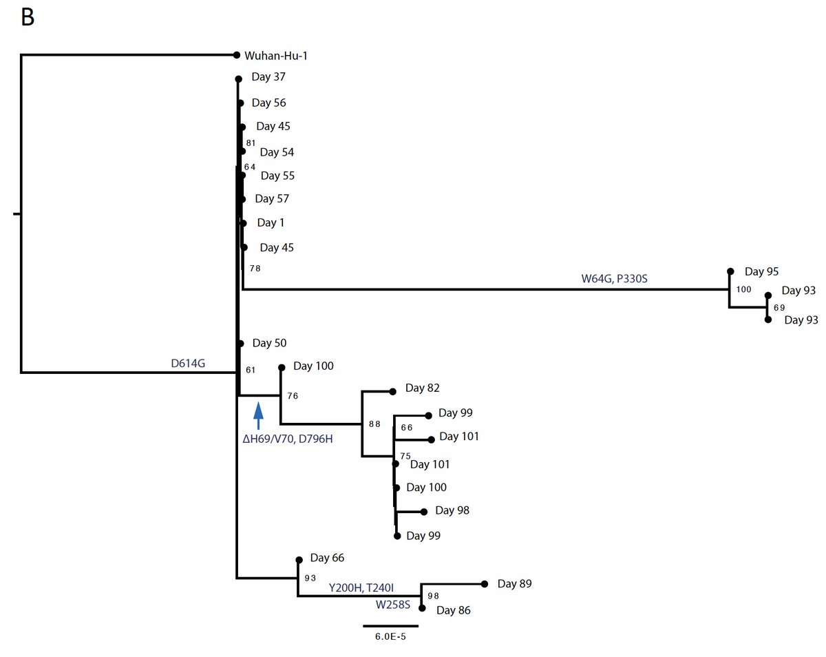 The first evidence of in vivo SARS-CoV-2 escape from antibodies: emergent Spike deletion H69/V70 and D796H mutation in a convalescent plasma (CP) treated patient. These mutations conferred reduced susceptibility to the CP and sera from multiple donors. medrxiv.org/content/10.110…