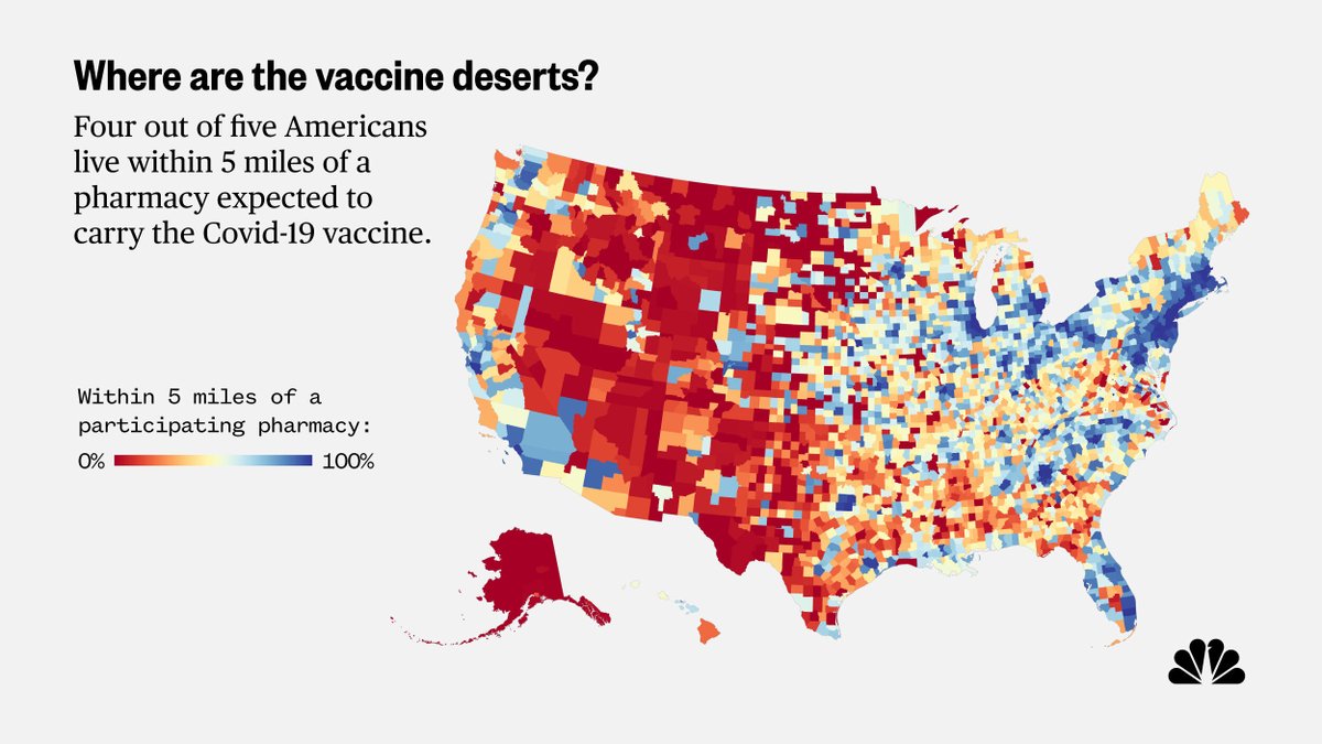 99% of Americans live within 50 miles of a pharmacy that is expected to carry the Covid-19 vaccine, a figure that drops to 80% within 5 miles and 34% within a mile.