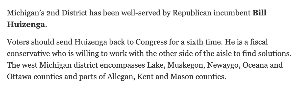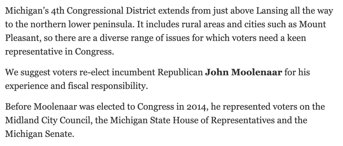 No fake claims of bipartisanship for John Moolenaar - he was called "a keen representative" and praised "for his experience and fiscal responsibility." Nothing about stealing elections, either!