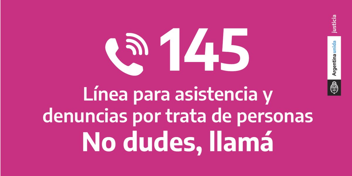 Y recordamos que el estado nacional cuenta con la línea 145 de asistencia y denuncia sobre trata de personas y la línea 137 contra la Explotación Sexual Contra Niñas, Niños y Adolescentes. Funcionan las 24 horas los 365 días del año