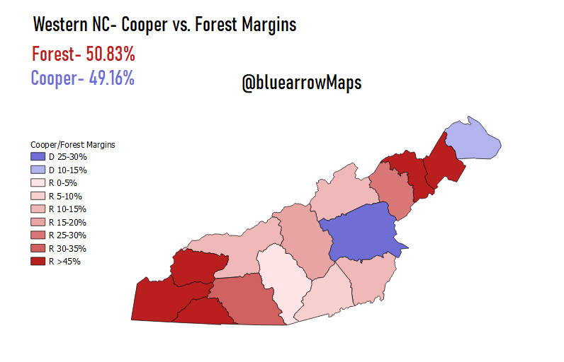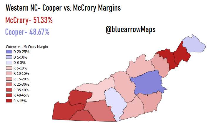 Cooper was also up for re-election in 2016, and did slightly worse, then, but actually won Jackson County. His margins went up in the more urban parts of the district (namely Asheville, Hendersonville, Transylvania, and metro Boone)