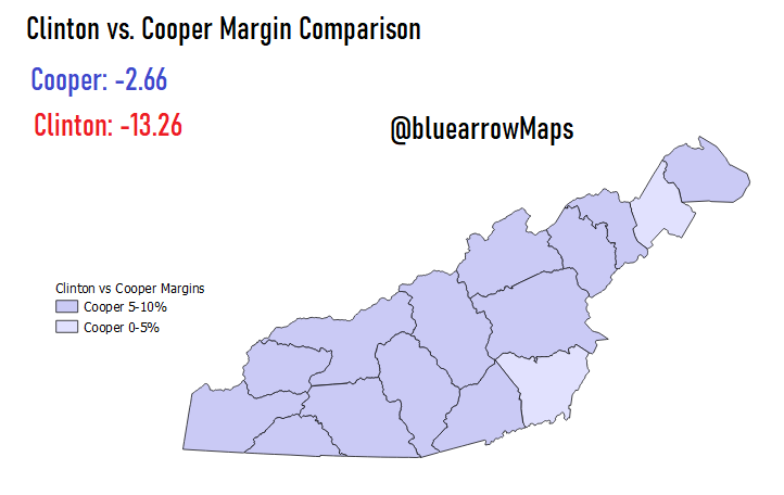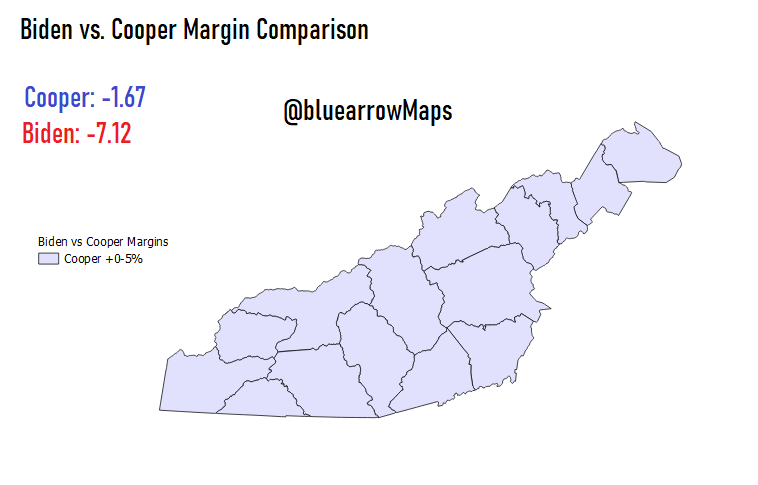 For sake of comparison, here's how much Cooper over-performed Biden and Clinton in each race. Only outperformed Biden by single digits, and Clinton double digits