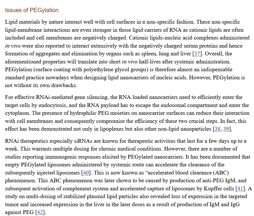 76/n Les nanoparticules lipidiques cationiques utilisées pour transporter l'ARN après divers essais, tendent à former des agrégats avec les protéines sériques à charge négative. C'est pourquoi on a dû ajouter du PEG (plyéthlylène glycol) pour les stabiliser.