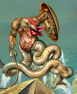 Por otro lado, los mitologistas antiguos colocaban a Abraxas entre los dioses egipcios, y algunos demonólogos suelen citarlo como un demonio con la cabeza de un rey o de un gallo y con serpientes en lugar de piernas (el Anguípedo).