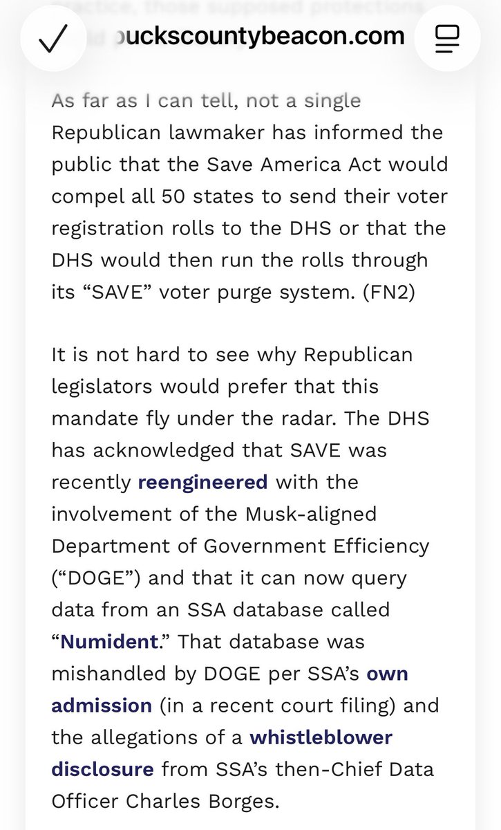 The SAVE America Act wld compel every state to submit their voter rolls to the DHS for purposes of running this data through DHS’s “SAVE” voter purge program, which was created in “partnership” w/ the SSA—whose data was mishandled by DOGE, as the DOJ now admits. #NoOnSAVE 1/