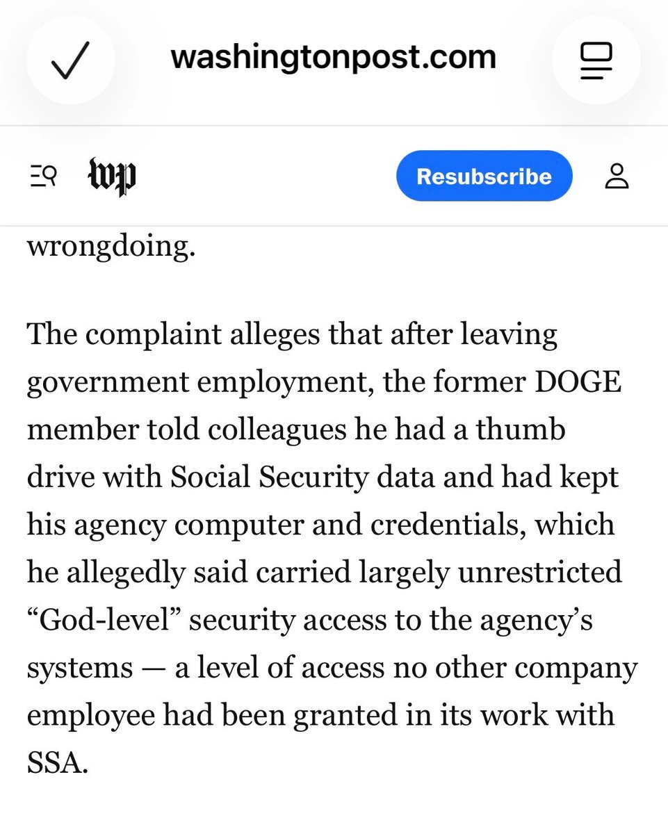 Here’s the complaint in the lawsuit still pending against DOGE & SSA: “Never before has a group of unelected, unappointed, & unvetted individuals—misleadingly & conflictingly described as White House employees, employees of agencies (multiple & many), & undefined ‘advisors’—-sought or gained access to such sensitive